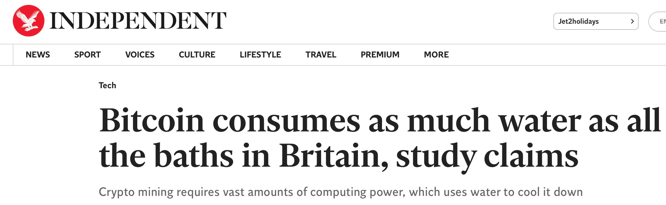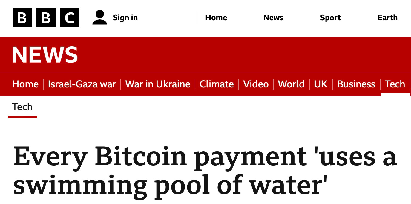The BBC's "Every Bitcoin payment 'uses a swimming pool of water'" and The Independent's "Bitcoin consumes as much water as all the baths in Britain" painted a picture of Bitcoin mining as a significant water consumer.