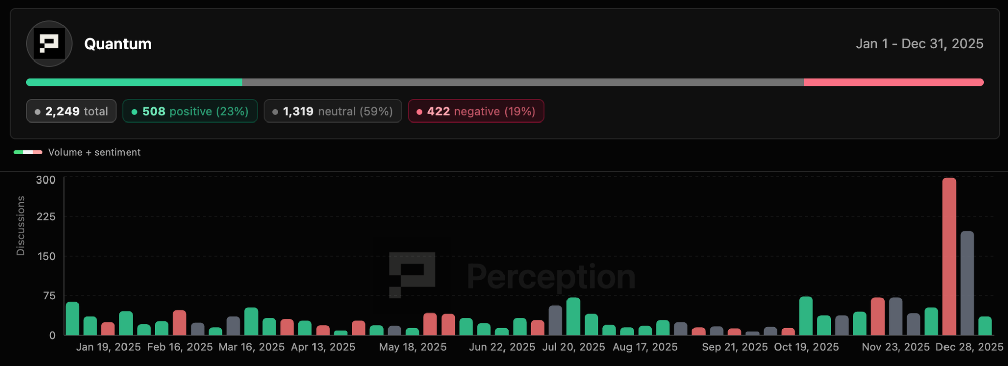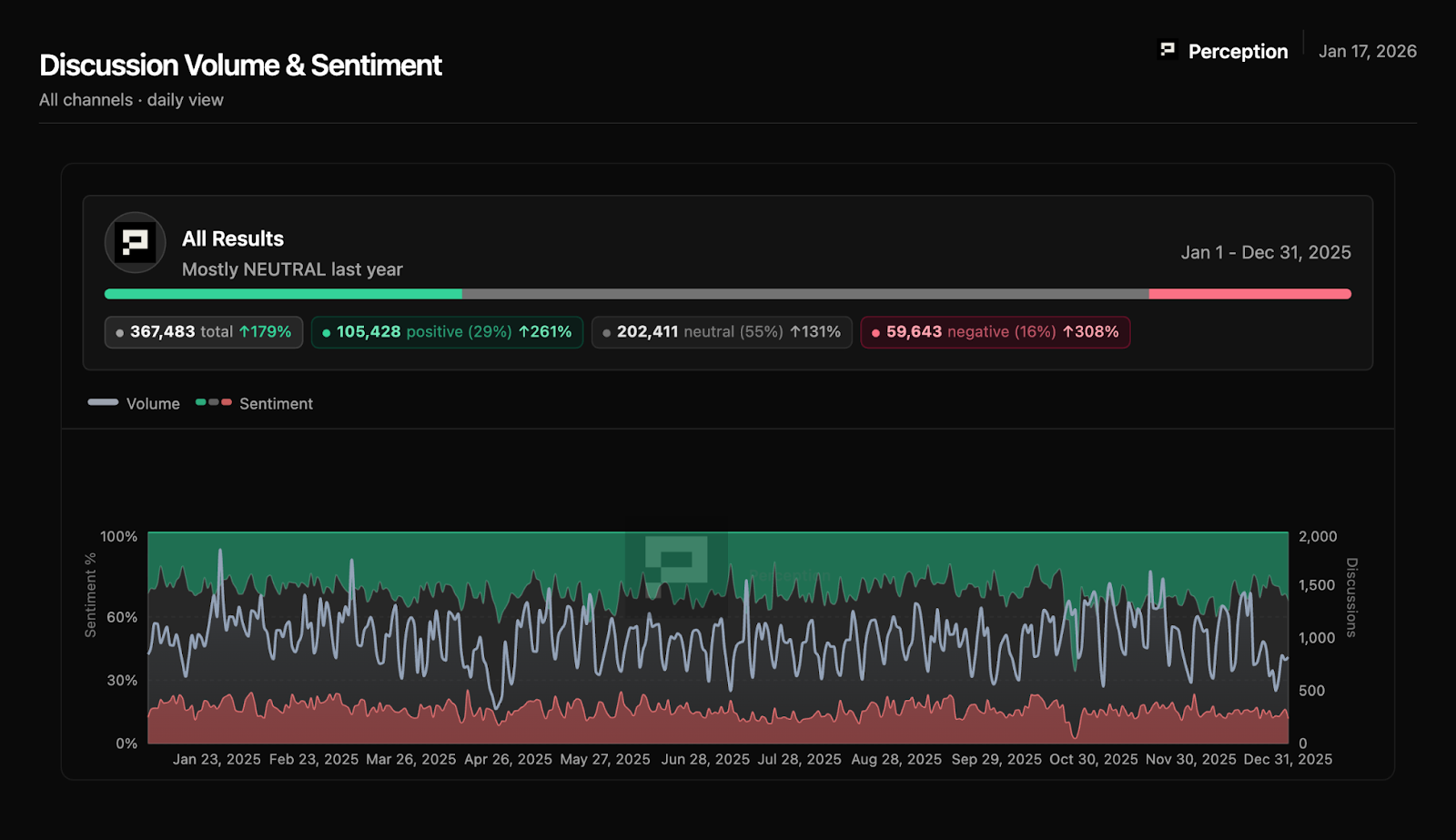 Prepared by Perception, this analysis covers 356,423 datapoints across 653 sources from January 1 to December 30, 2025. Unlike traditional media monitoring that tracks volume, we focus on sentiment structure and narrative patterns, the second-order signals that reveal where perception is heading and why it matters for anyone building, investing, or communicating in this space.