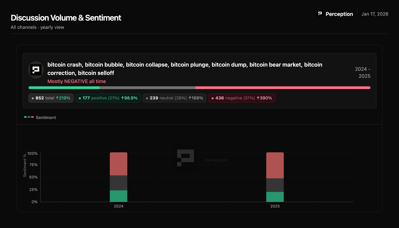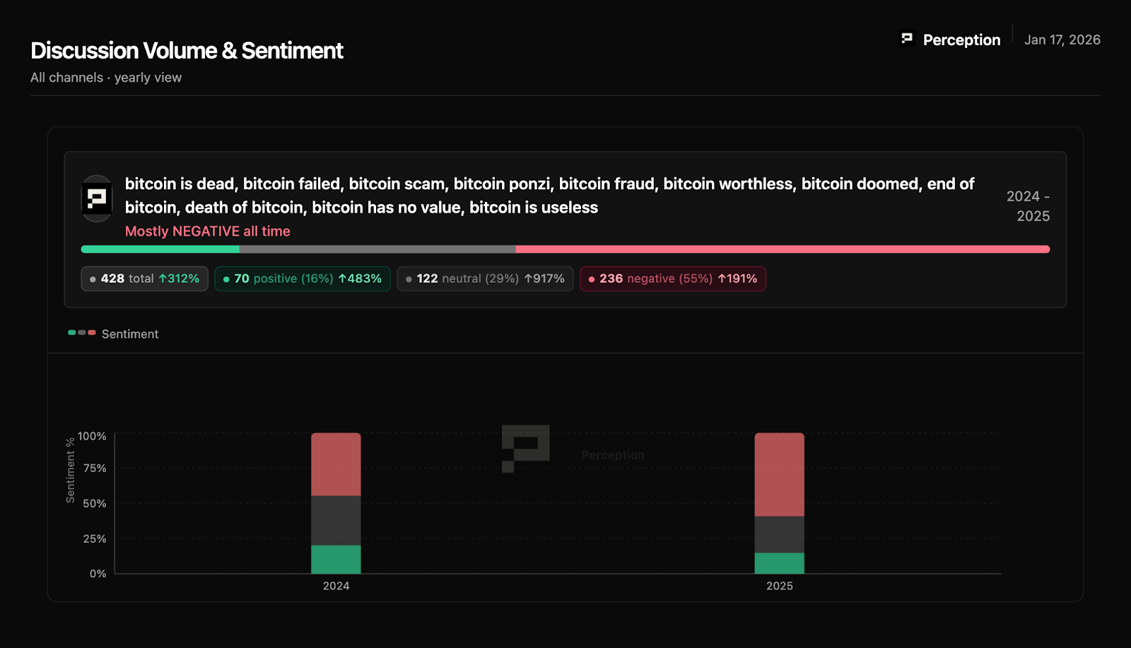 When we say "negative coverage stayed between 12-18% all year," this measures the share of ALL Bitcoin mentions carrying negative sentiment. The stability of this range is the insight. FUD volume is constant, but topics rotate.
