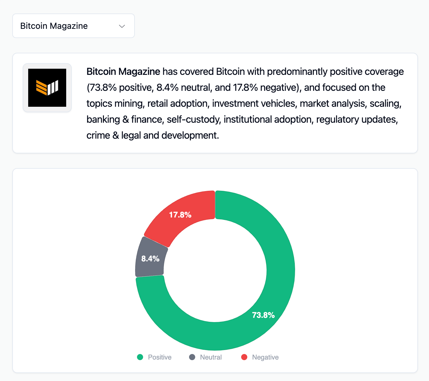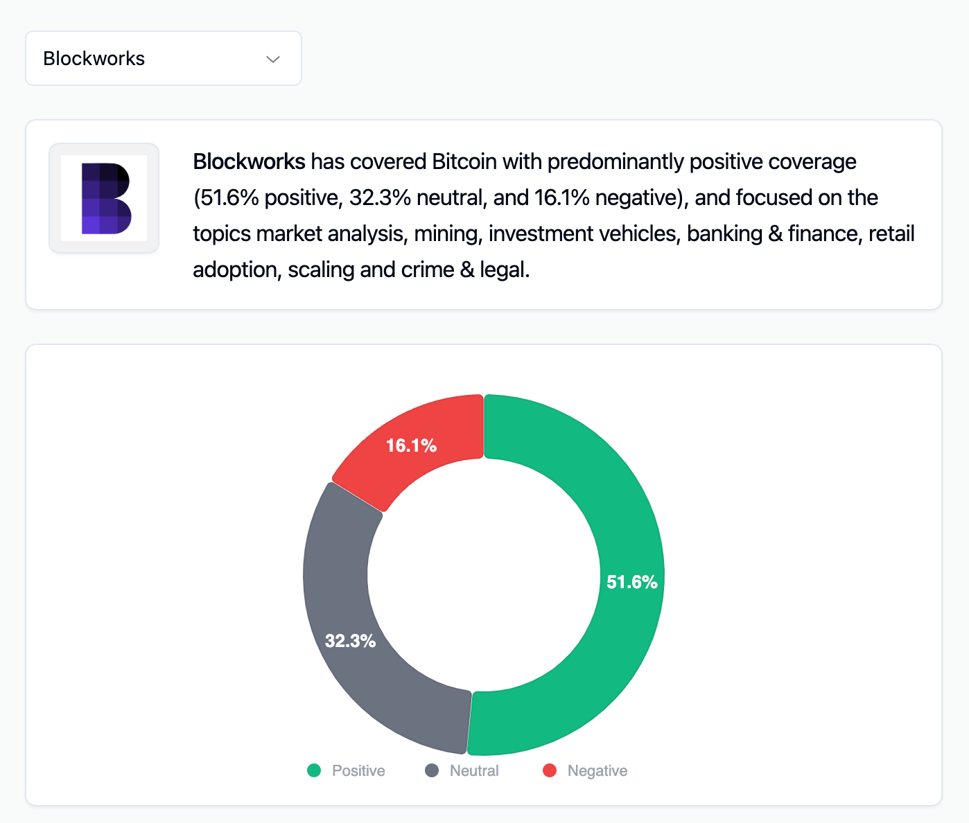 By quantifying the tone of coverage (positive, neutral, or negative) and examining the topics each outlet focused on, we provide a benchmark for who is pushing the Bitcoin narrative forward — and who is sitting on the fence.