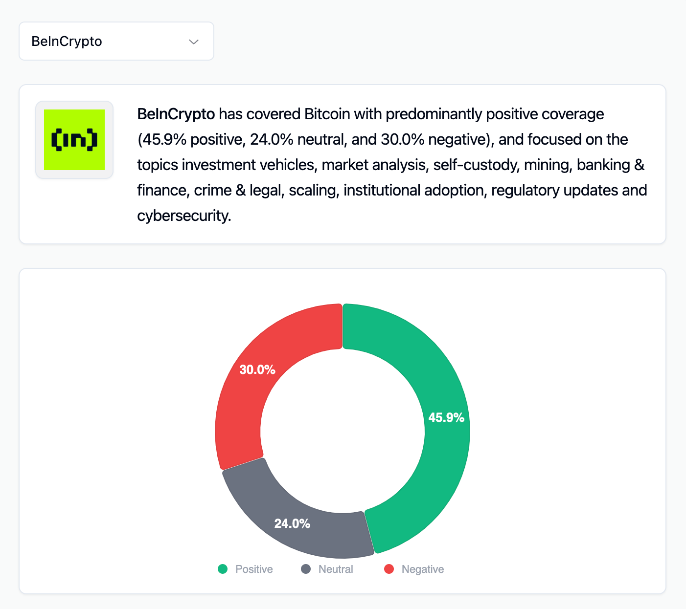 BeInCrypto had 45.9% positive coverage but a relatively high negative percentage (30%). It still covered self-custody, investment vehicles, and mining regularly, though its tone fluctuated across narratives.