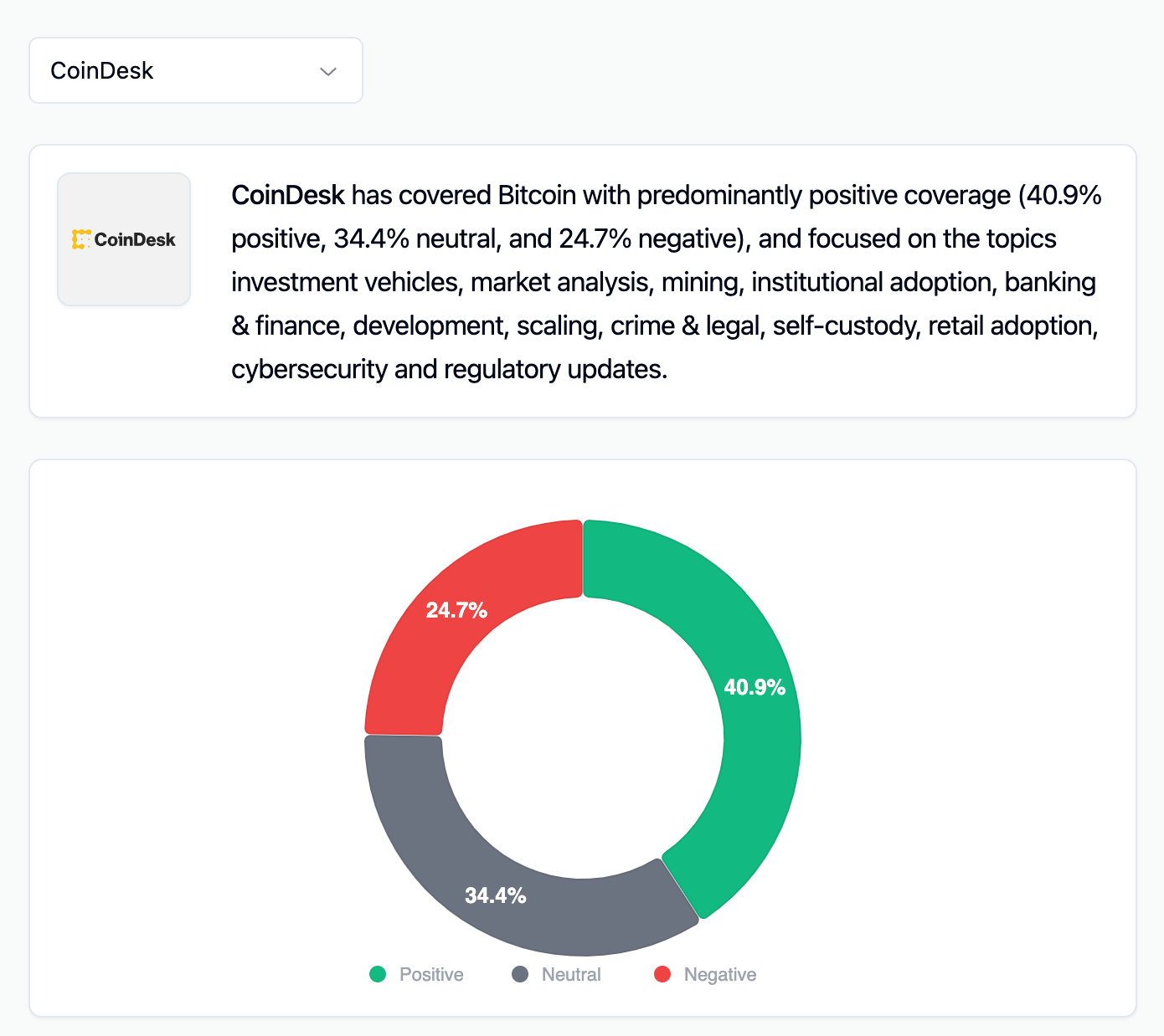 CoinDesk leaned neutral, with balanced topic coverage spanning institutional adoption, development, and regulation. Despite its reputation, it remained more cautious in tone than many of its peers.