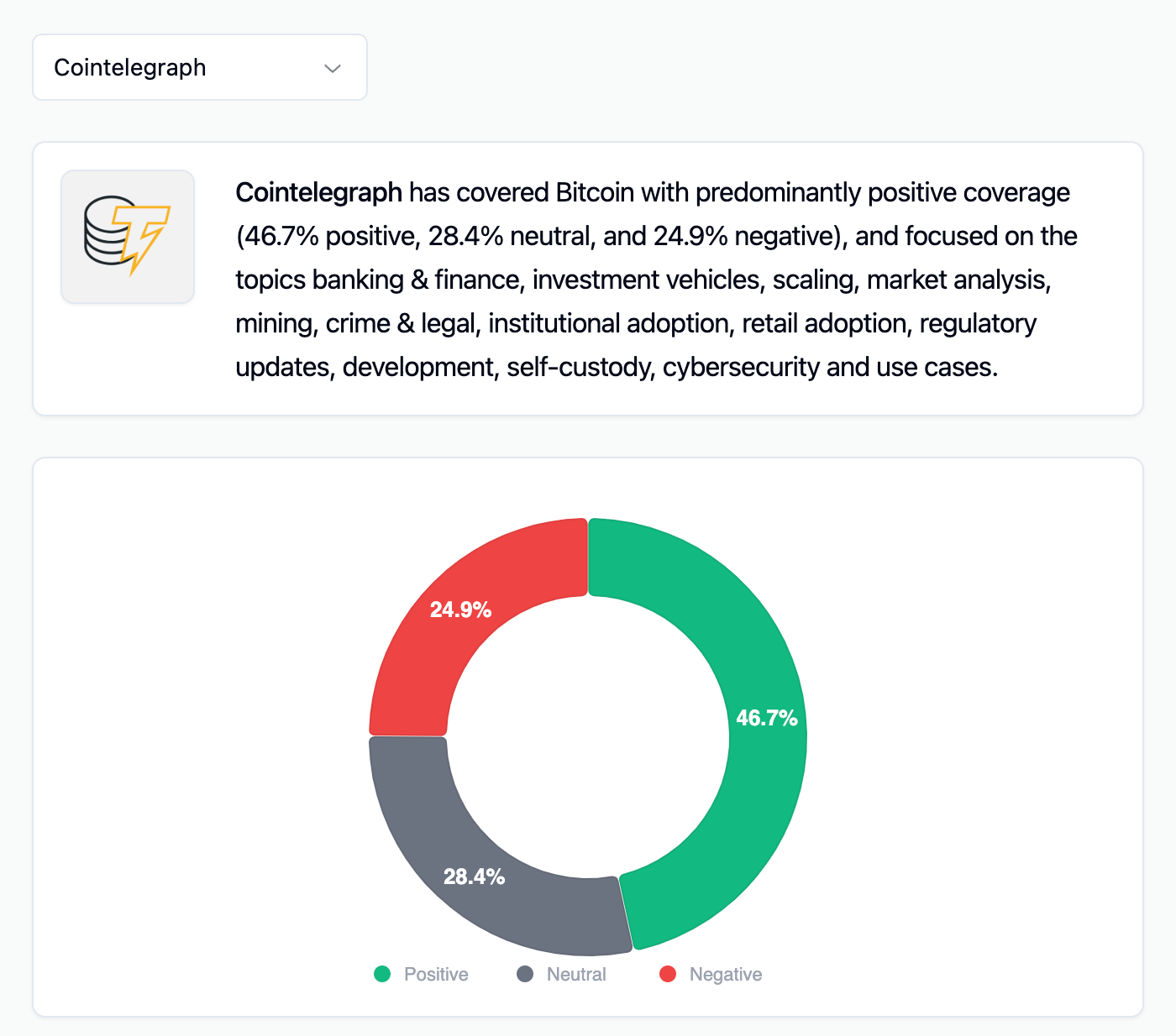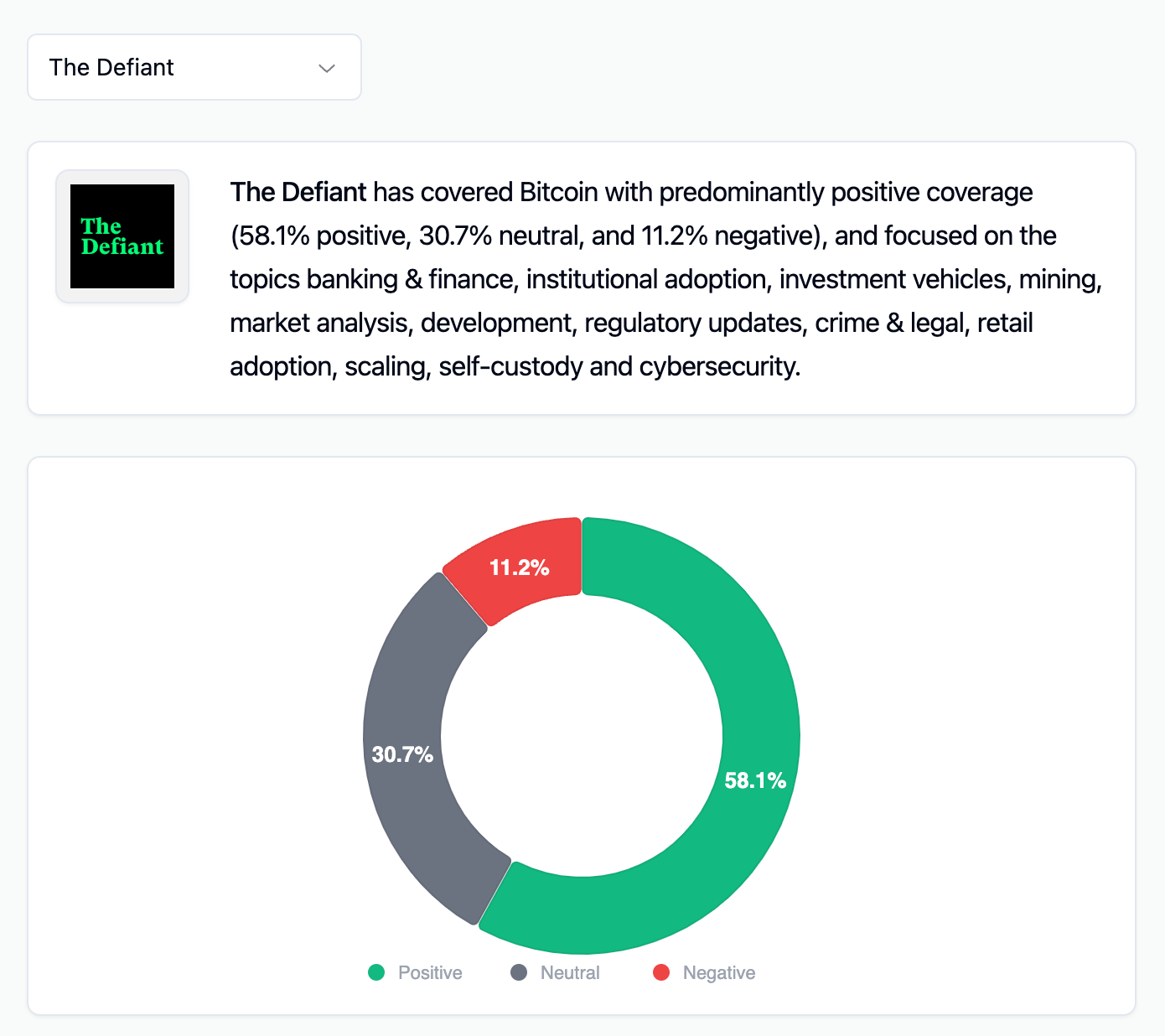 Bitcoin Magazine, Cointelegraph and The Defiant emerged as strong narrative drivers, while CoinDesk, Decrypt, and The Block leaned into neutrality or caution.