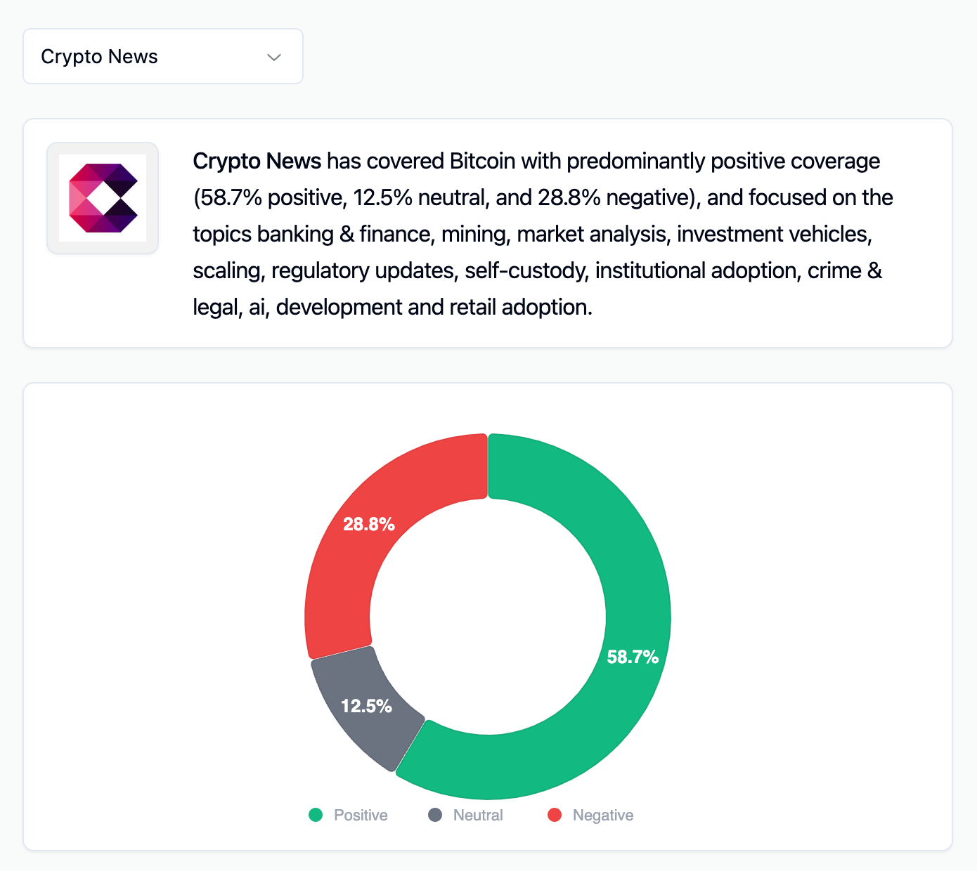 Crypto News leaned heavily into bullish coverage, particularly around banking & finance, mining, and retail adoption. It also showed strong engagement with AI topics — a unique inclusion among crypto-native outlets.