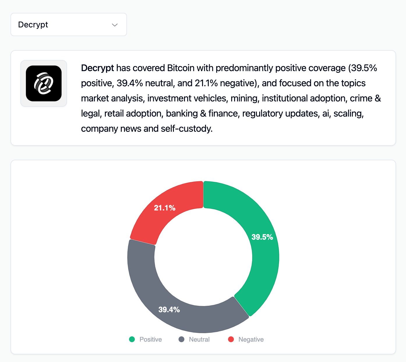 Decrypt presented the most evenly split tone: 39.5% positive and 39.4% neutral. It gave airtime to retail, company news, and AI but showed restraint in leaning strongly pro-Bitcoin.