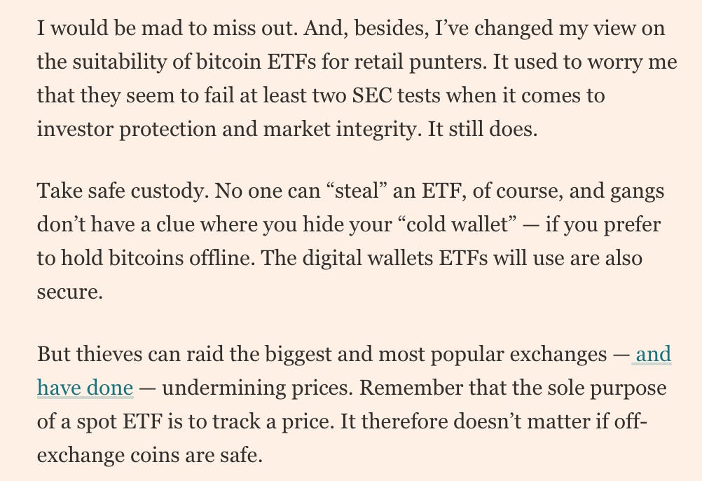 He notes, 'No one can 'steal' an ETF, of course, and gangs don’t have a clue where you hide your 'cold wallet' — if you prefer to hold bitcoins offline. The digital wallets ETFs will use are also secure.'