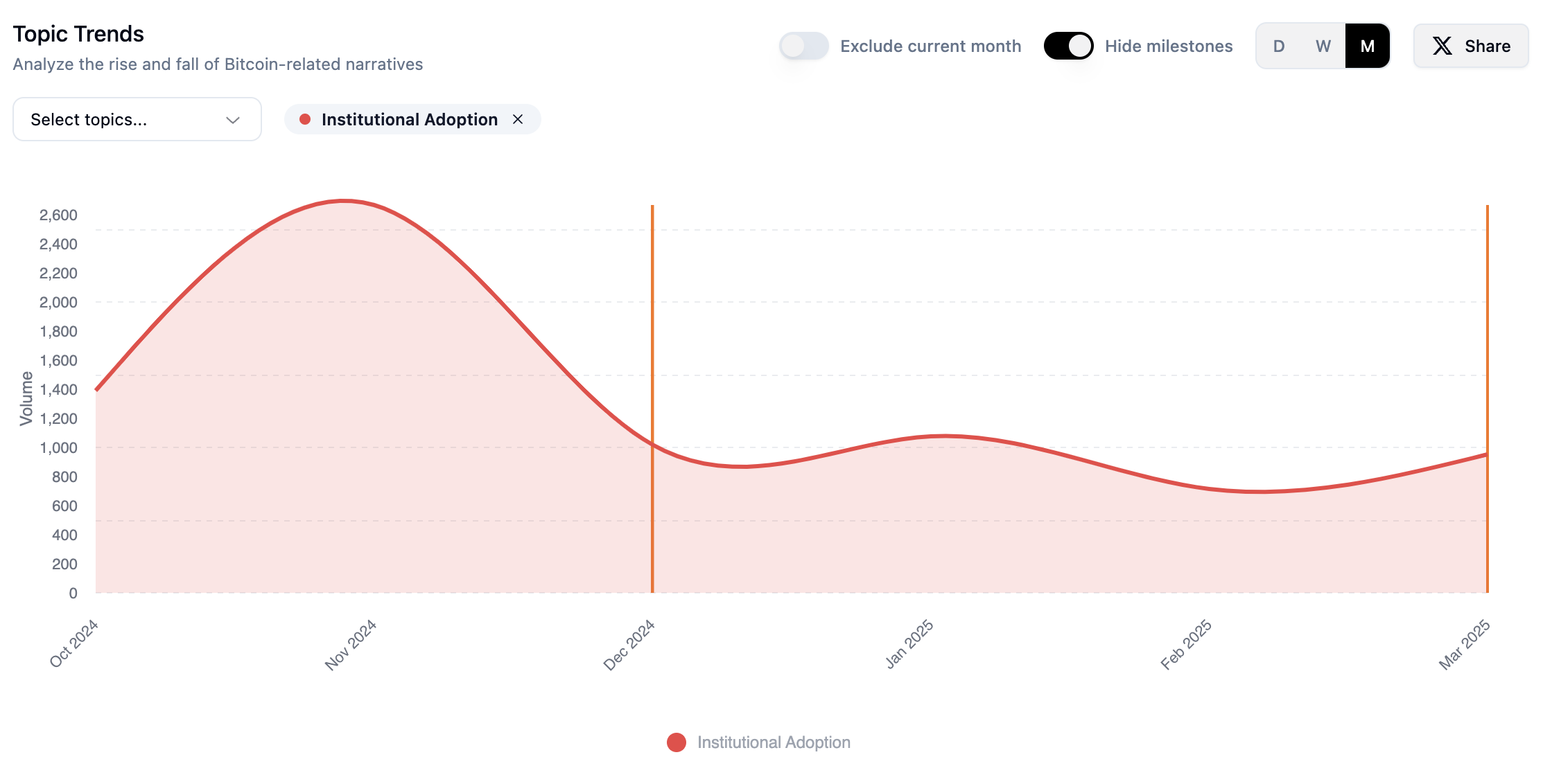 - Institutional adoption narratives grew steadily through Q4 2024 but contracted following major milestones (BTC > $100K and SBR news).