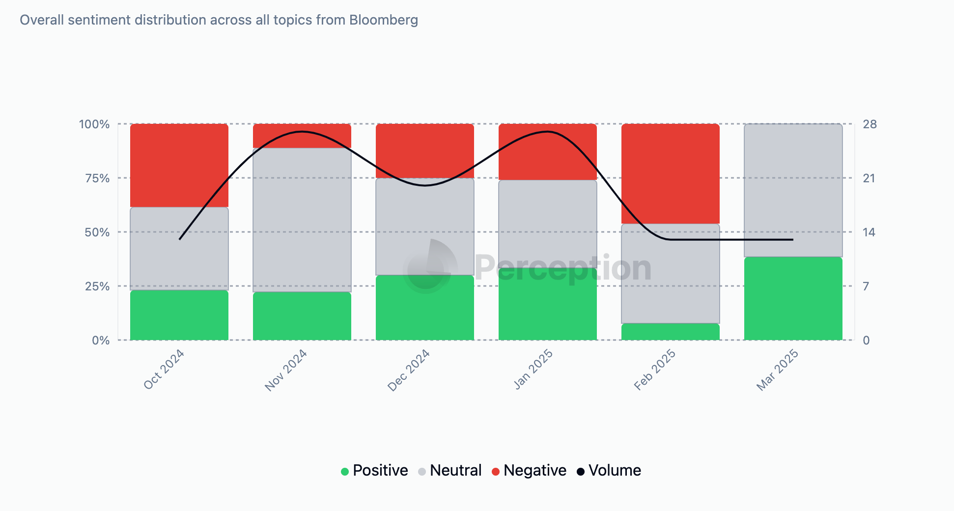 Media sentiment fluctuated sharply, with a low point in January coinciding with Trump’s inauguration. Bloomberg notably corrected its tone in March after a particularly negative February.