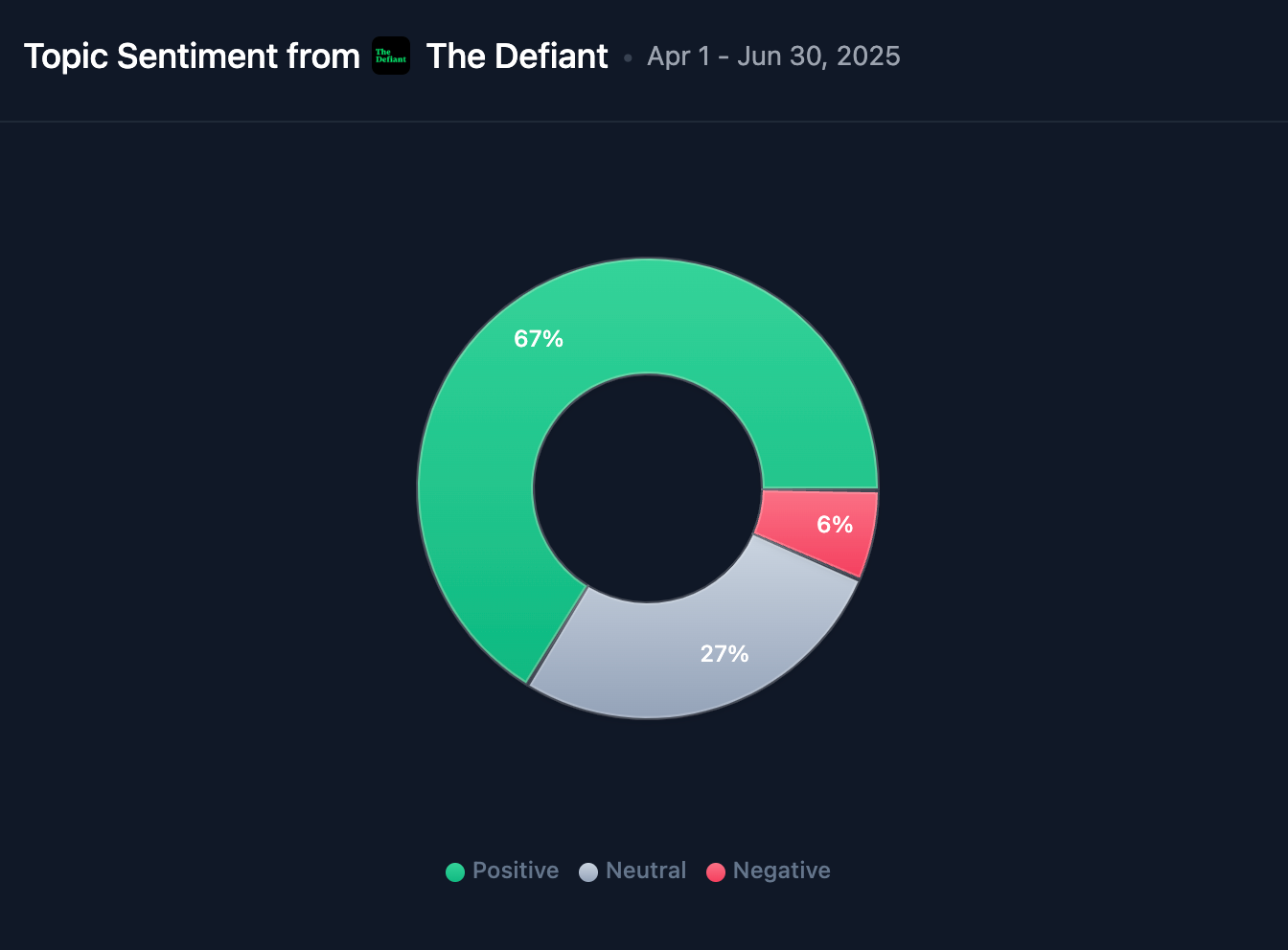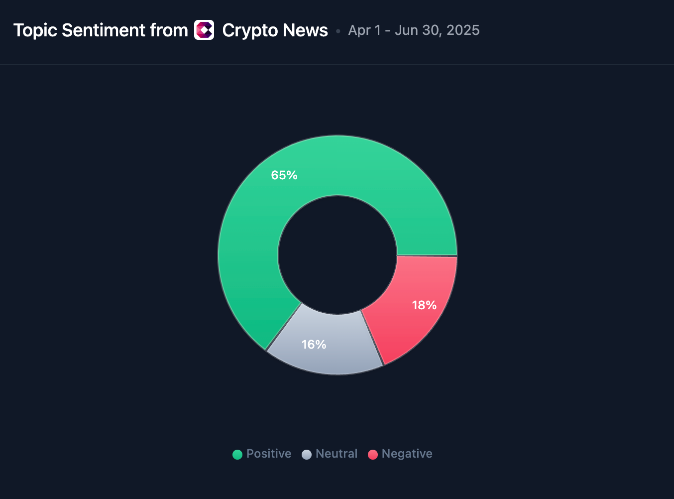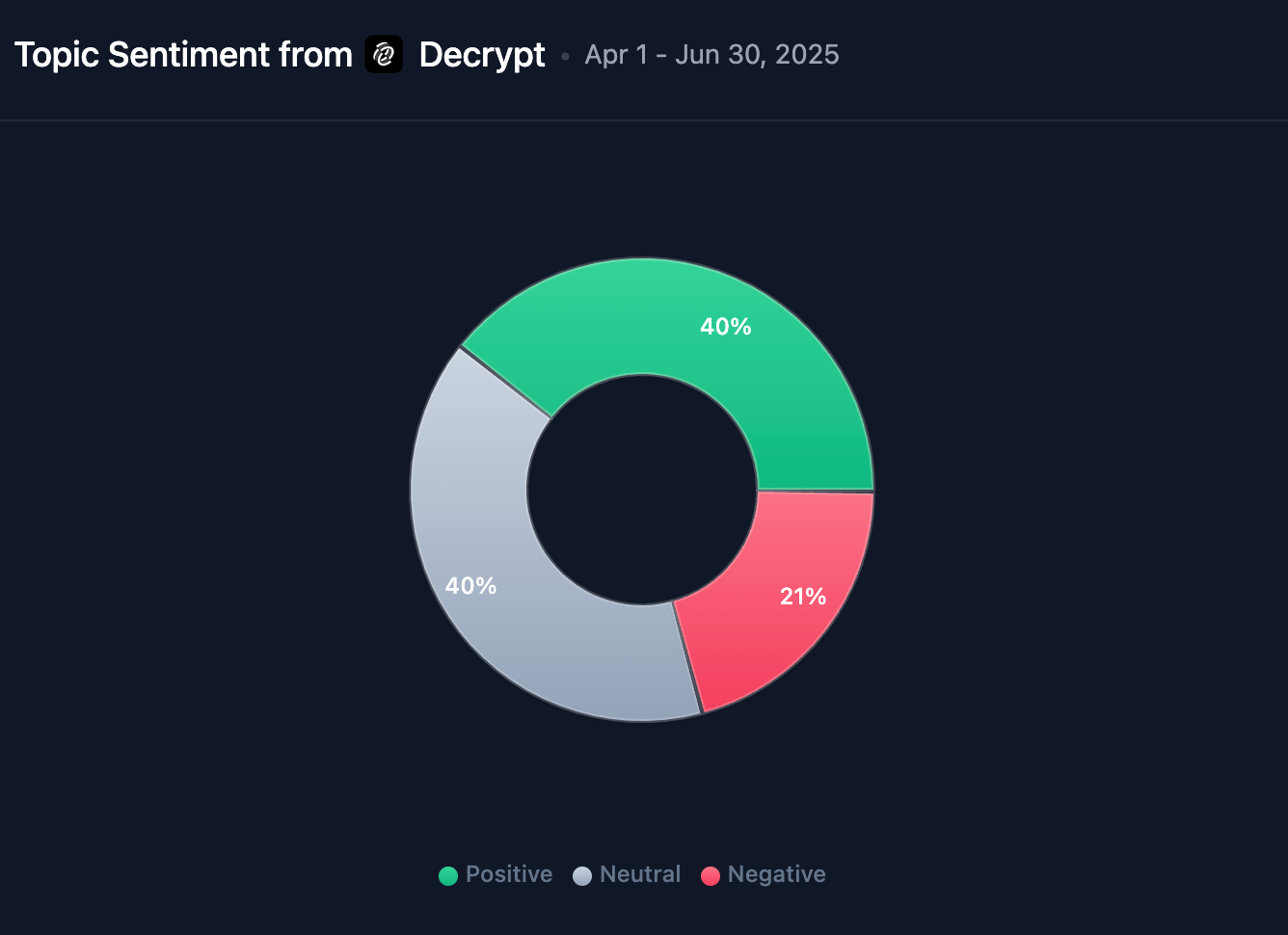 Across 2,695 articles from 10 leading crypto publications, sentiment averaged 55% positive, 28% neutral, and 17% negative: a dramatic contrast to mainstream media's 31% positive, 41% neutral, 28% negative split.