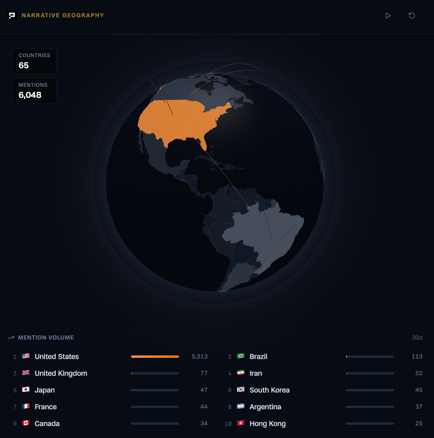 45 mentions across Perception's sources in seven days. 55.6% positive. Almost none from crypto media. Central banks, treasury departments, banking regulators.