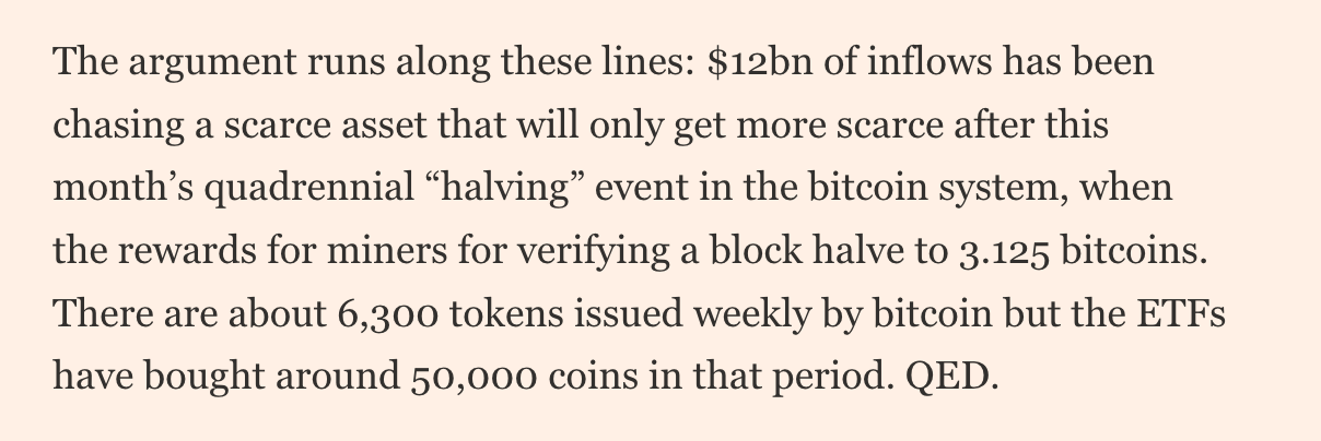 The otherwise not-so-friendly Financial Times seems to get around this concept as well, and chose to actually educate their readers on not only the Halving, but also its relation to the inflows/outflows dynamic of the ETF.