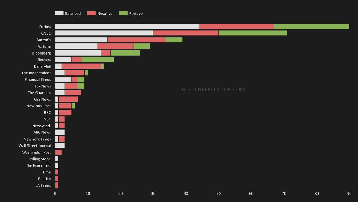 In fact, over the last 30 days, more than half of the total media outlets reporting that Bitcoin Perception is tracking, have not offered a single piece of positive coverage on Bitcoin, underscoring a pervasive bearish sentiment in mainstream reporting.