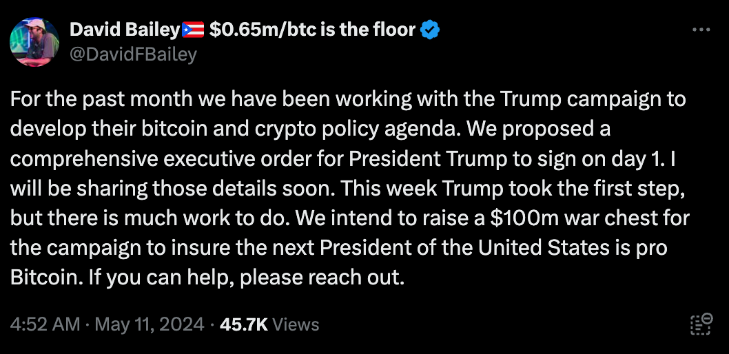 - Adding a new dimension to the discourse, Politico's Jasper Goodman published an article titled "Crypto is Trump's new weapon against Biden" signaling a shift in the political dynamics surrounding Bitcoin.