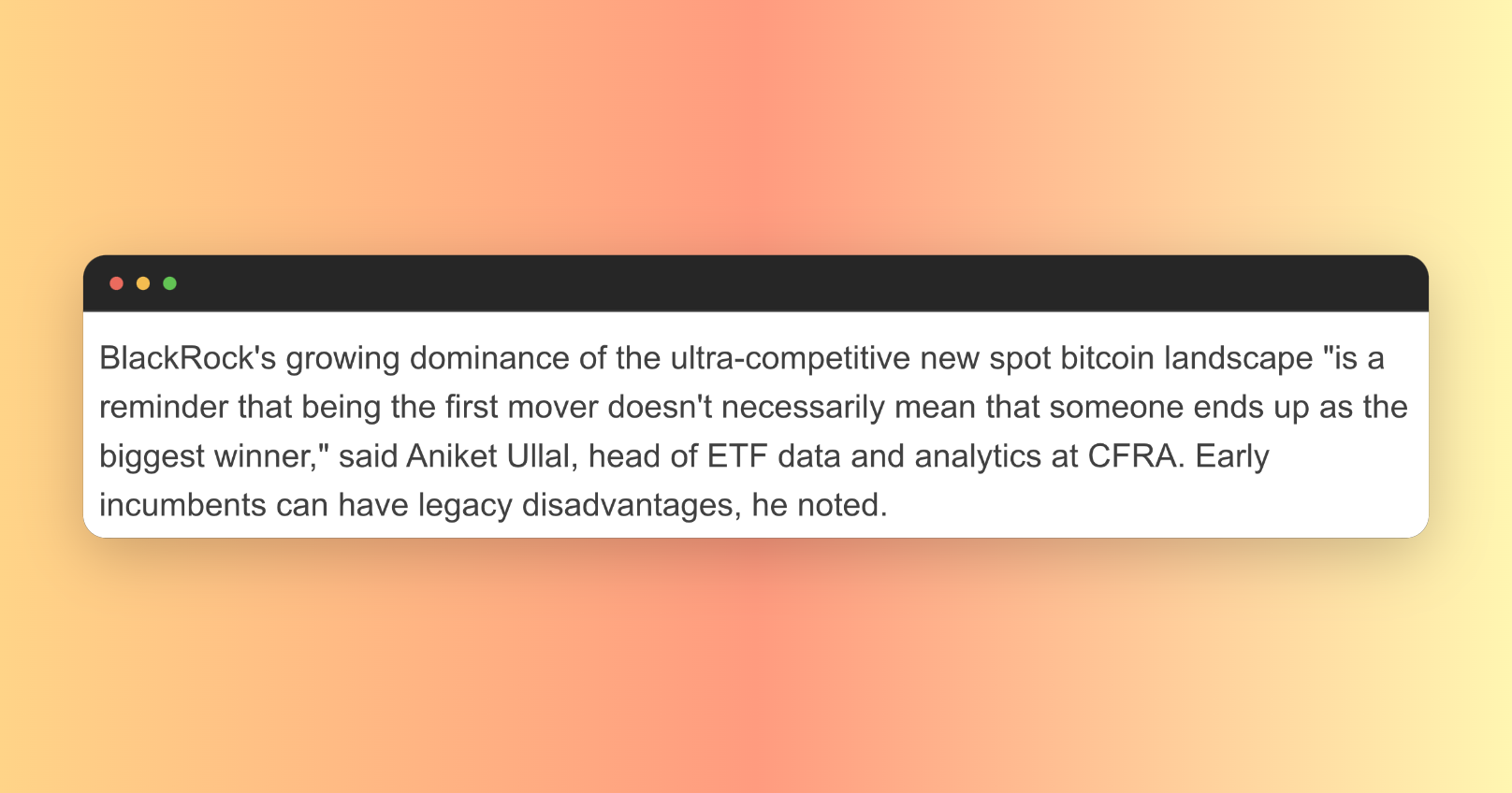 The article emphasized the competitive landscape and regulatory impacts, with a notable quote from Aniket Ullal, head of ETF data and analytics at CFRA: