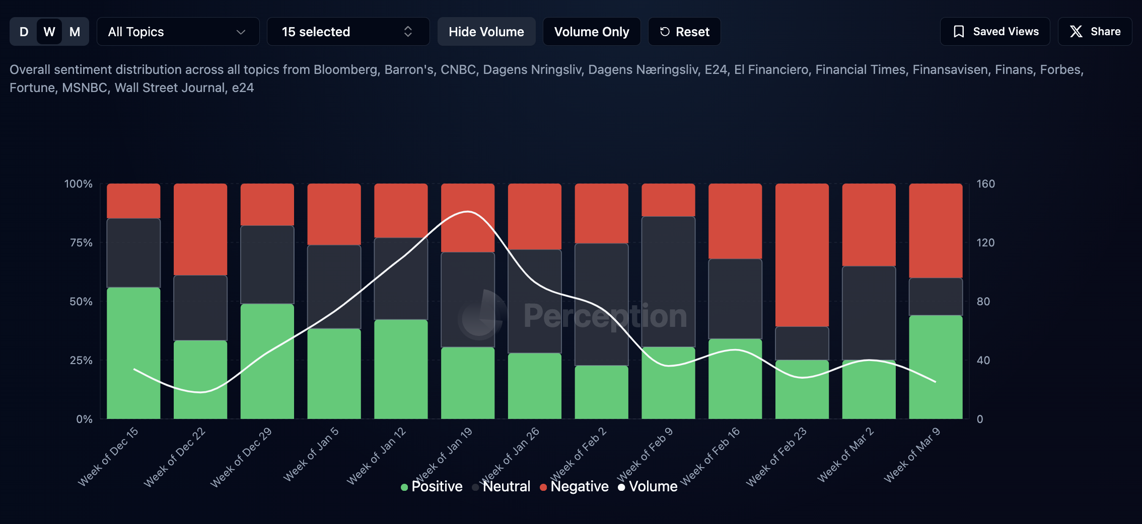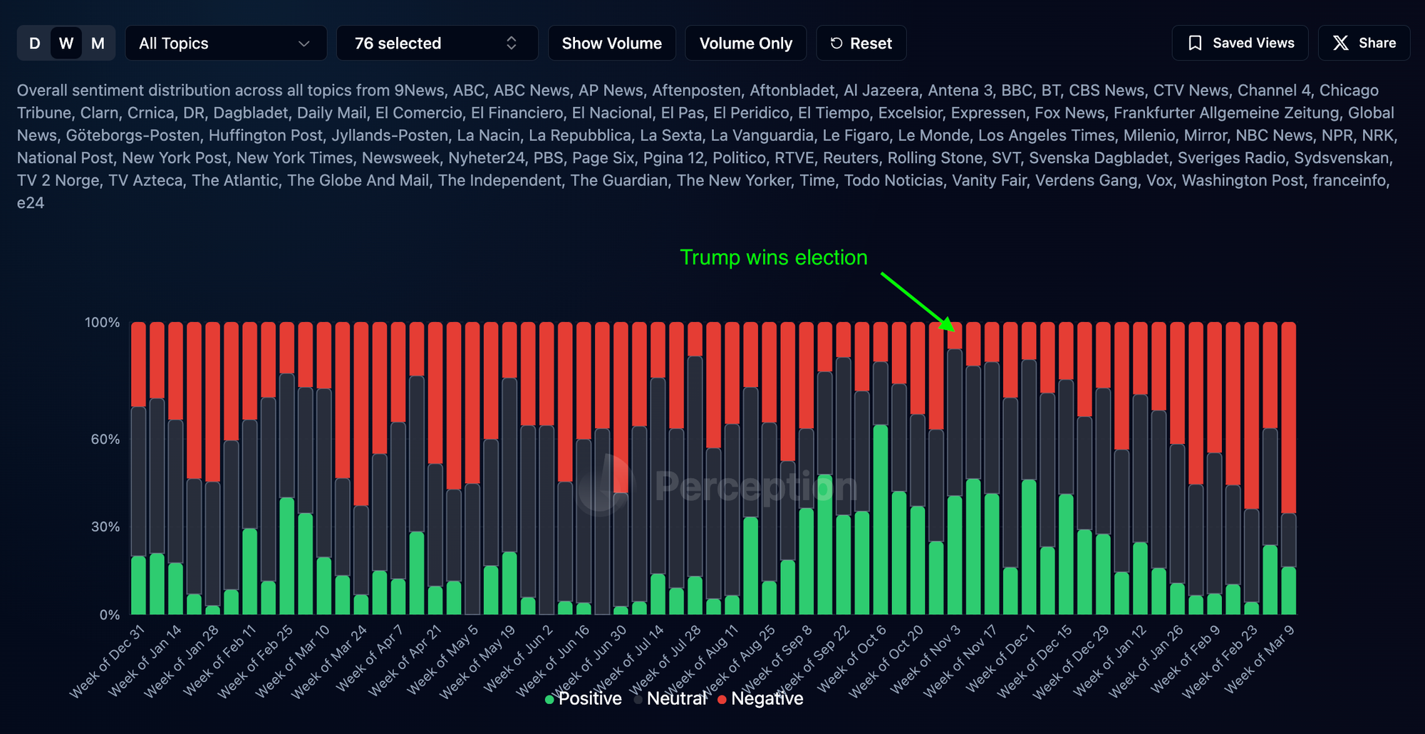 Political events clearly influence short-term volatility in media coverage, but beneath the surface, sentiment remains surprisingly stable and is actually leaning positive again.