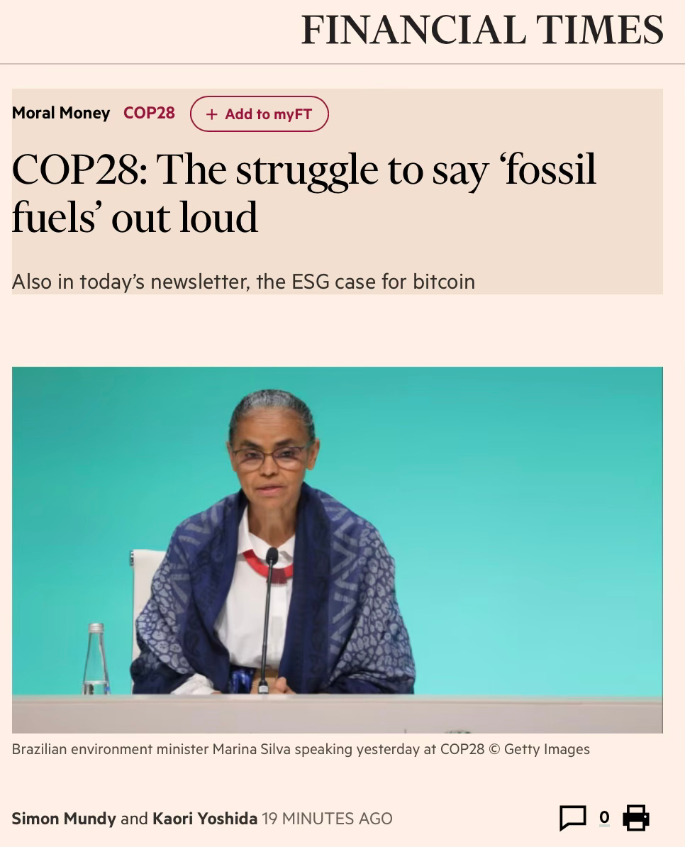 The discourse surrounding Bitcoin's environmental impact has undergone a significant transformation, as highlighted in a recent Financial Times article titled "COP28: The struggle to say ‘fossil fuels’ out loud."